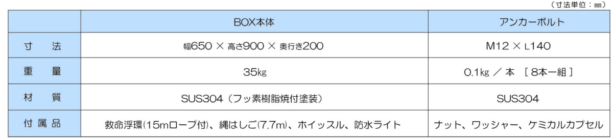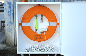落水者救助の浮環、陸に上がるはしご、周囲に知らせるホイッスル、夜間用のライトをセットにし収納しています。 - BOX収納で劣化・紛失・いたずらを防止、どんな場所にも設置可能!