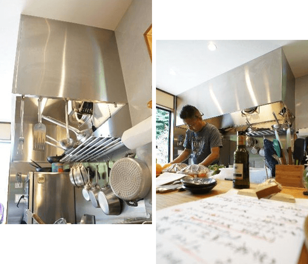 糸島市にあるイタリア料理店のグランデリ様の移転に伴い、厨房に必要なレンジフードの製作依頼をご縁があって当社にいただき