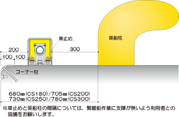 【 参考配置図 】岸壁法線・車止め間を200㎜、車止め・係柱間を300㎜空けた場合