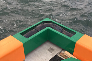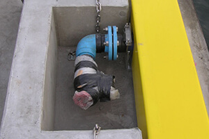 岸壁角部もコラムのL型溶接・上部開口により管の内蔵が可能です。管設置後に上部蓋の取付を行います。