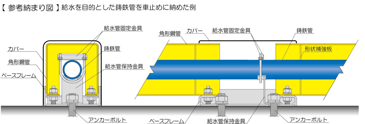 車止め内部には管を支持する固定用の金具を設けて、コラムは内部に補強板を施したスリット形状にしています。