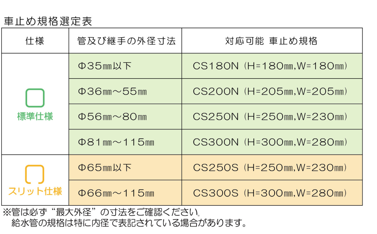 選定された仕様と管及び管の連結に用いる継手の最大の外径寸法により、施工可能な車止めの規格を選定します。