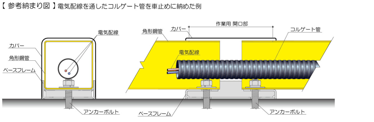 管内蔵車止めは、コラムストッパーの内部空間に管を内蔵できるよう加工を施した車止めです。