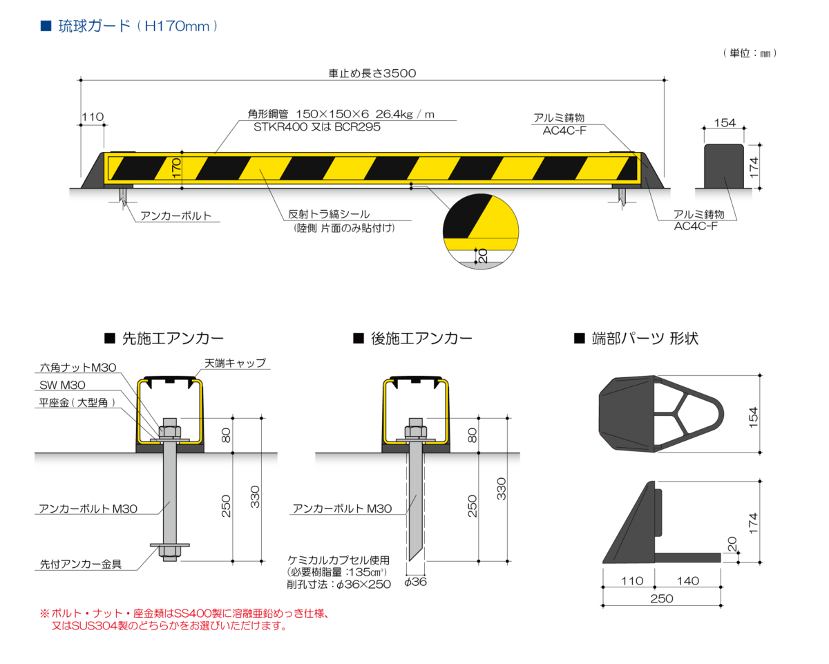 また、車止め長さに関わらず1基につきアンカーボルト2本で施工が行えます。