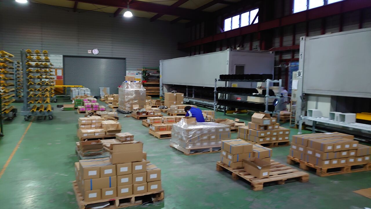 事務所、工場内にある出荷前の製品、加工前の材料、アンカーボルトなどの部材類、
