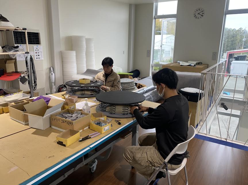 普段、重たーい車止めを扱ってる製造部も椅子に座ってコツコツ作業してます。