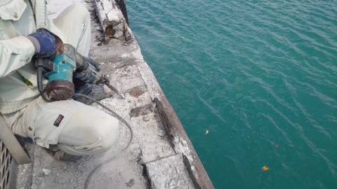 人力による地道なハツリ作業は、体力勝負な面も強く交代で行われており、スラッシュカットによる切断が行えない申し訳なさと共に、