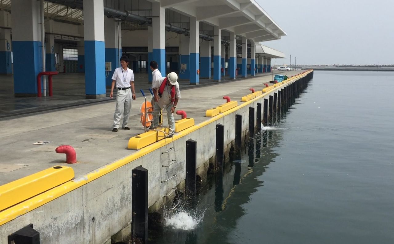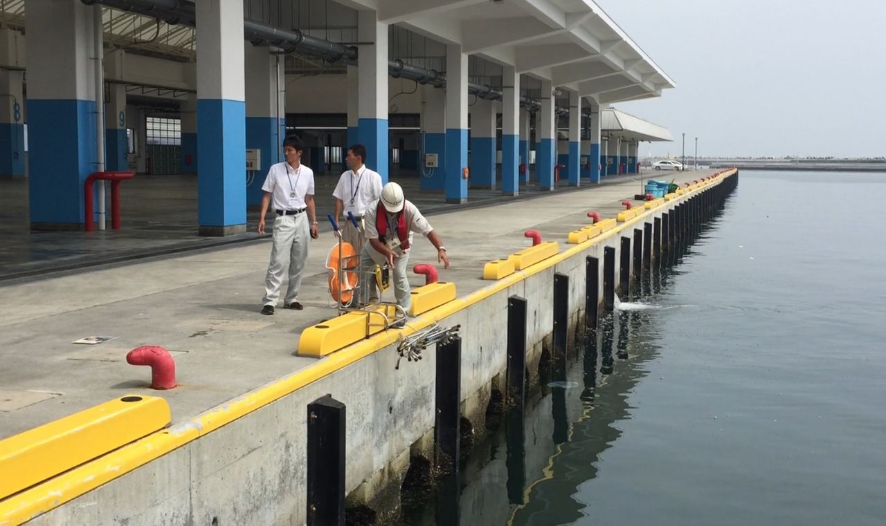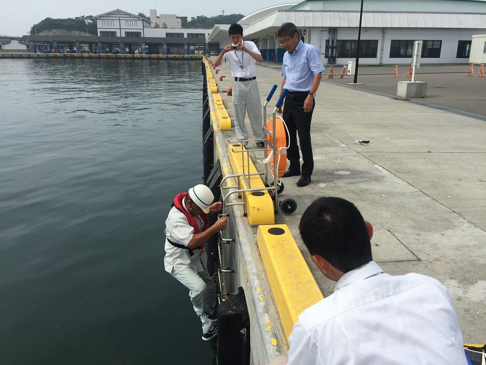 相馬港湾建設事務所の方々と現場で検証。実際に使用していただき 「しっかりしていて、登りやすい」 と、うれしいお言葉をいただきました。