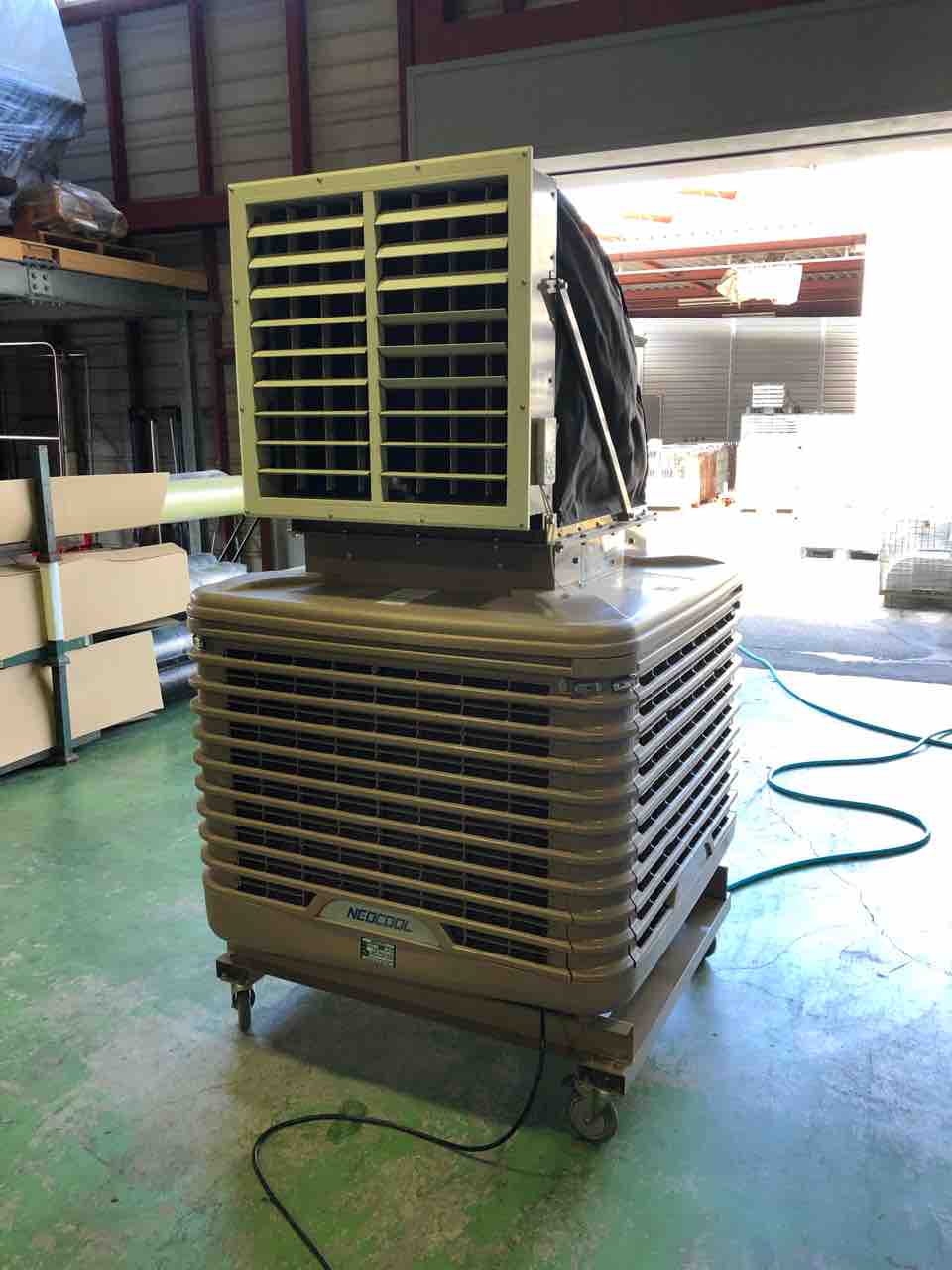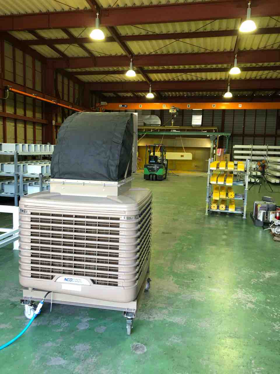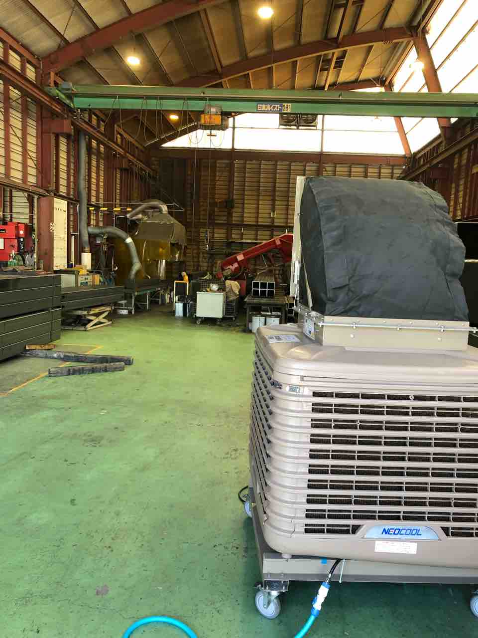 スポットクーラーや扇風機で何とか凌いでいましたが、今日、大型の冷風機をレンタルしていただきました!!