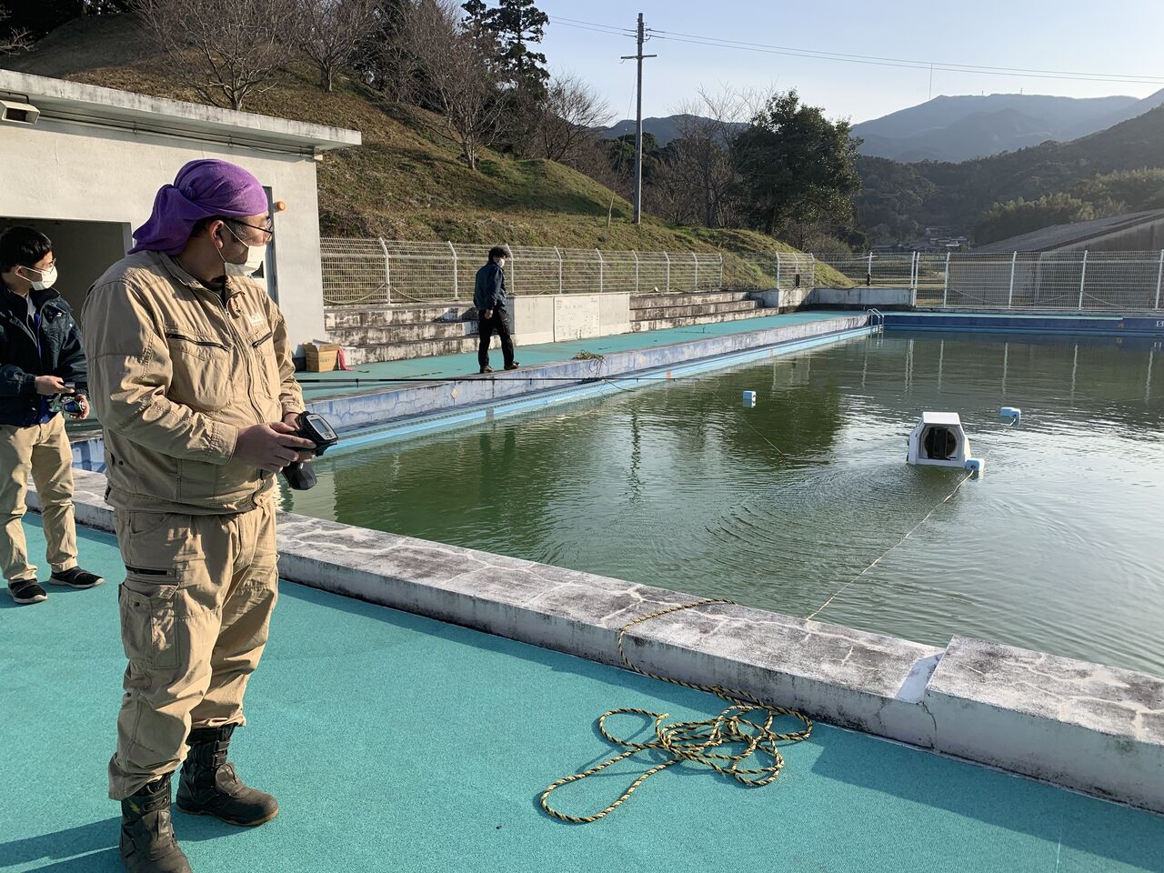 今回は現場のプールサイズになるようロープで区切り走行テストを行いました。