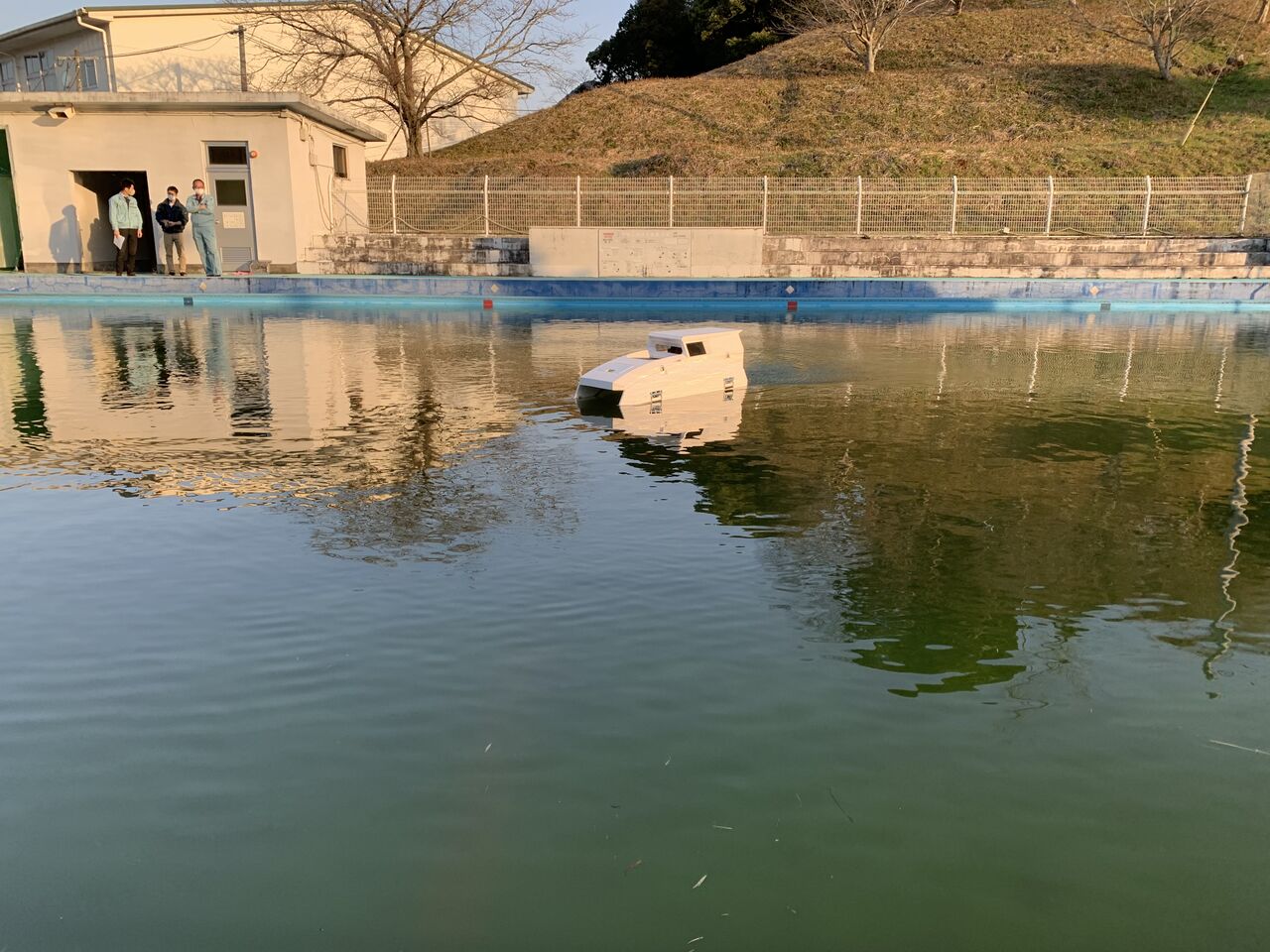 夕暮れ時のプールを走る3代目エコボートはこの後塗装され納品準備に入っていきます。