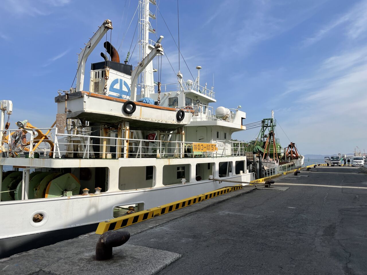 先日、改良して初めてコラムガードの連続型(コラム4~5本の連続)を納入させていただきました福山港の施工現場におじゃましました。