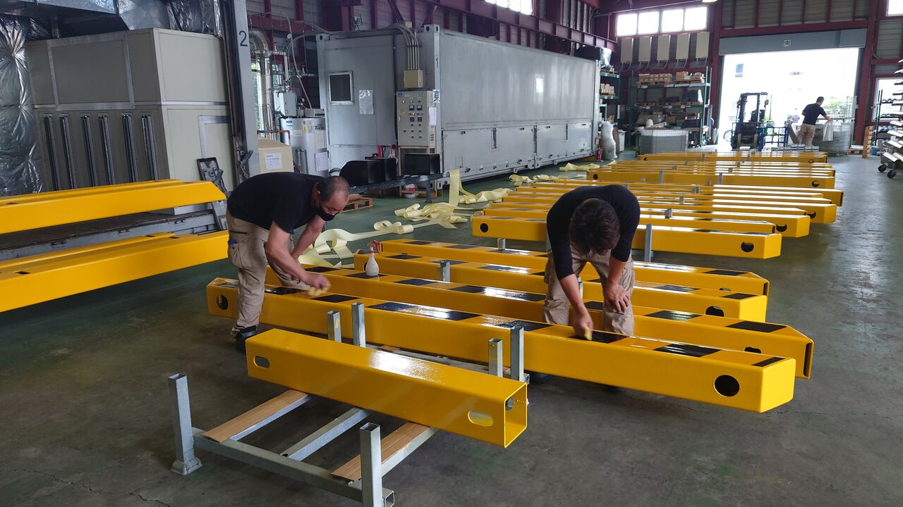 各車止めの長さにカットしたトラ縞反射シールを二人一組で貼付けます。