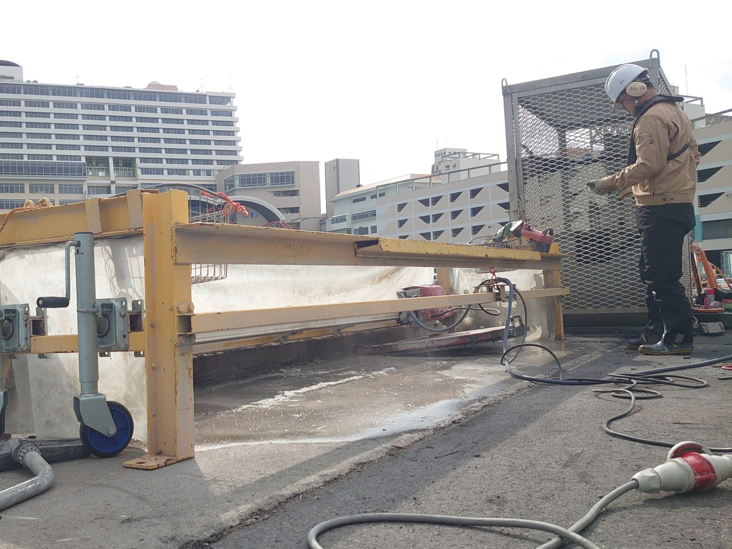 ウォールソーに角度を持たせてコンクリートごと車止めのアンカーボルトを切断する工法です。