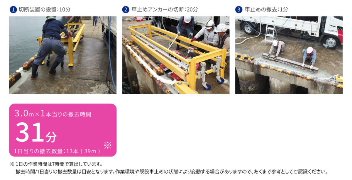 主な工程は、①切断装置の設置②車止めアンカーの切断③車止めの撤去の3工程のみで作業時間を約1/3に短縮しました。